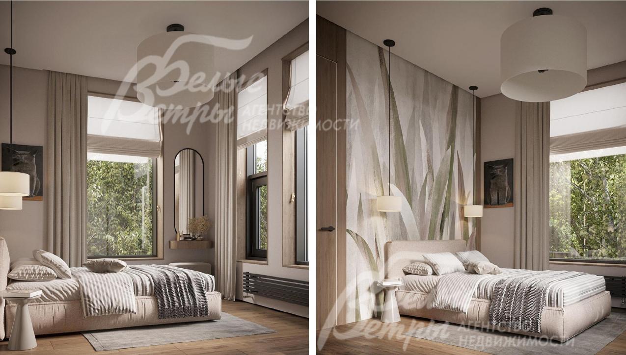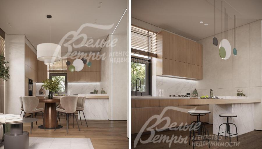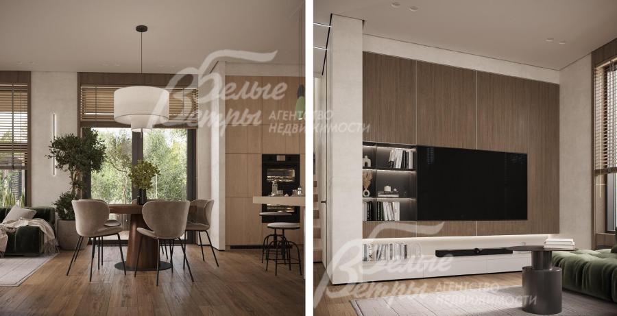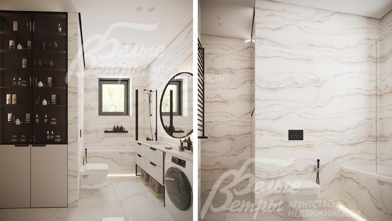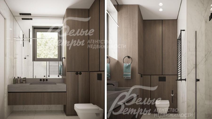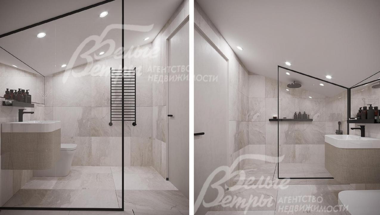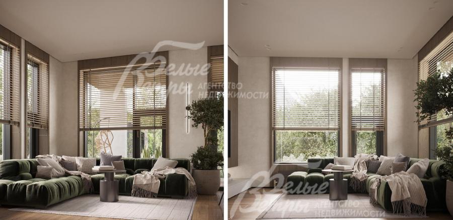 Описание внутренней отделки: выполнена современная стильная отделка под ключ. Стены: в жилых помещениях выкрашены – матовые светлые пастельные оттенки, двери – в цвет стен; в санузлах – крупноформатная плитка серых цветов. На полу: в прихожей, санузлах, гардеробной – плитка с подогревом; в остальных помещениях - дубовая инженерная доска (ламинат). Потолки – натяжные. Установлены: входная дверь и дверь на террасу со стеклом, подоконники около 50 см высотой от пола. На второй этаж ведёт железобетонная монолитная лестница со ступенями, отделанными массивом дуба
