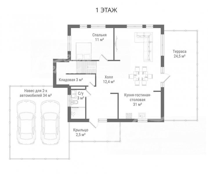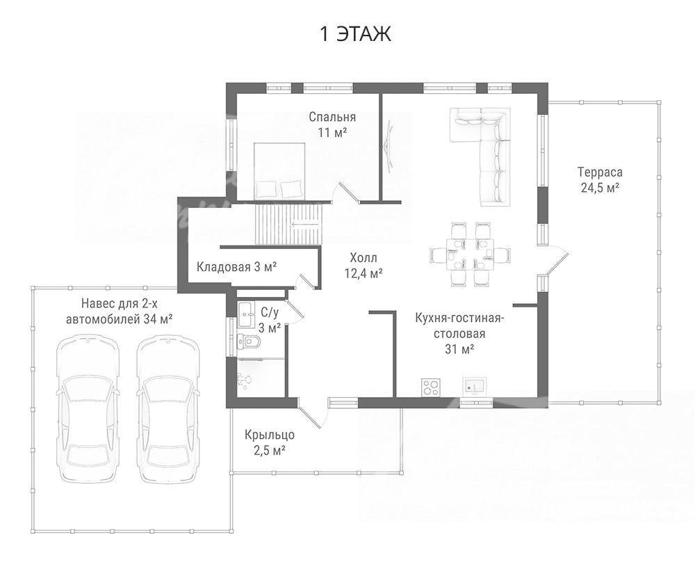 1-ый этаж: крыльцо 2,5 кв.м, холл 12,5 кв.м, кухня-гостиная-столовая 31 кв.м, спальня 11 кв.м, санузел 3 кв.м, кладовая 3 кв.м, терраса 24,5 кв.м, навес для 2-х автомобилей 24,5 кв.м