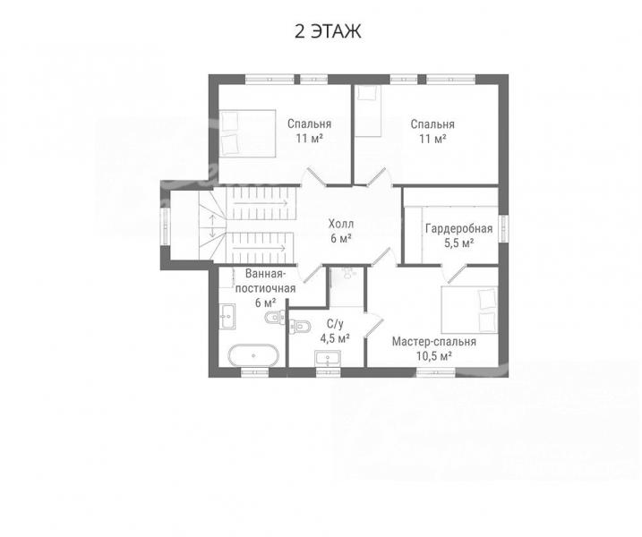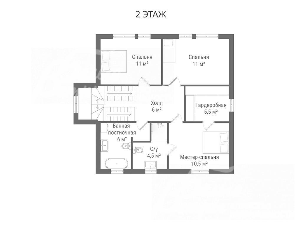 2-ой этаж: коридор 6 кв.м, мастер-спальня 10,5 кв.м с гардеробной 5,5 кв.м и санузлом с ванной 4,5 кв.м, спальня 11 кв.м, спальня 11 кв.м, ванная-постирочная 6 кв.м