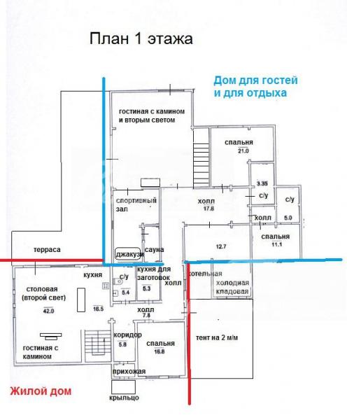 1-ый этаж: прихожая, коридор, спальня, гостиная-кухня-столовая со вторым светом и камином, с/у, хозяйственная комната для припасов, коридор во второй дом; холл, чемоданная, гостиная с камином и выходом на патио и в сад, СПА: тренажерный зал, джакузи, с/у