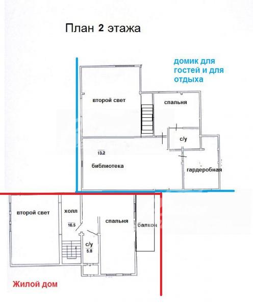 2-ой этаж: спальня с с/у и небольшим коридором, детская спальня с с/у, библиотека, второй свет, холл. Во второй части дома на втором этаже расположены: спальня с с/у, главная спальня с с/у и балконом, кладовая