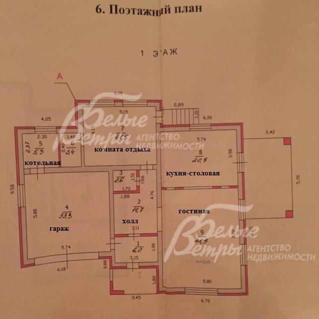 1-ый этаж: Прихожая 6 кв.м, холл 11.7кв.м, с/узел, гараж 33 кв.м, котельная 5 кв.м, гостиная 41 кв.м с камином, Кухня-столовая 23 кв.м из кухни выход на террасу 20 кв.м, комната отдыха 21.5 кв.м с душевой, сауна.