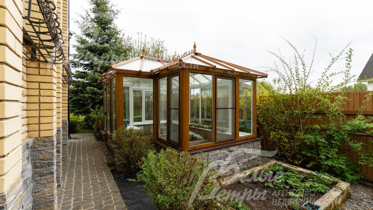 Дом отделан облицовочным кирпичом, рваным камнем, много декора из искусственного камня