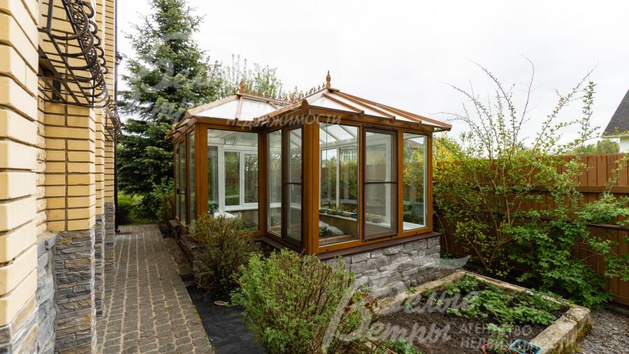 Дом отделан облицовочным кирпичом, рваным камнем, много декора из искусственного камня