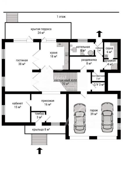 1-ый этаж: крытое крыльцо 8 кв.м, тамбур 3 кв.м, прихожая 16 кв.м, просторный кабинет 15 кв.м, холл 3 кв.м, гостиная 38 кв.м с выходом на террасу 24 кв.м, кухня-столовая 18 кв.м, лестничный холл 20 кв.м, гараж 39 кв.м, гостевой санузел 3 кв.м, предбанная раздевалка 8 кв.м, душевая 4 кв.м, сауна 6 кв.м, коридор 3 кв.м, котельная 6 кв.м.