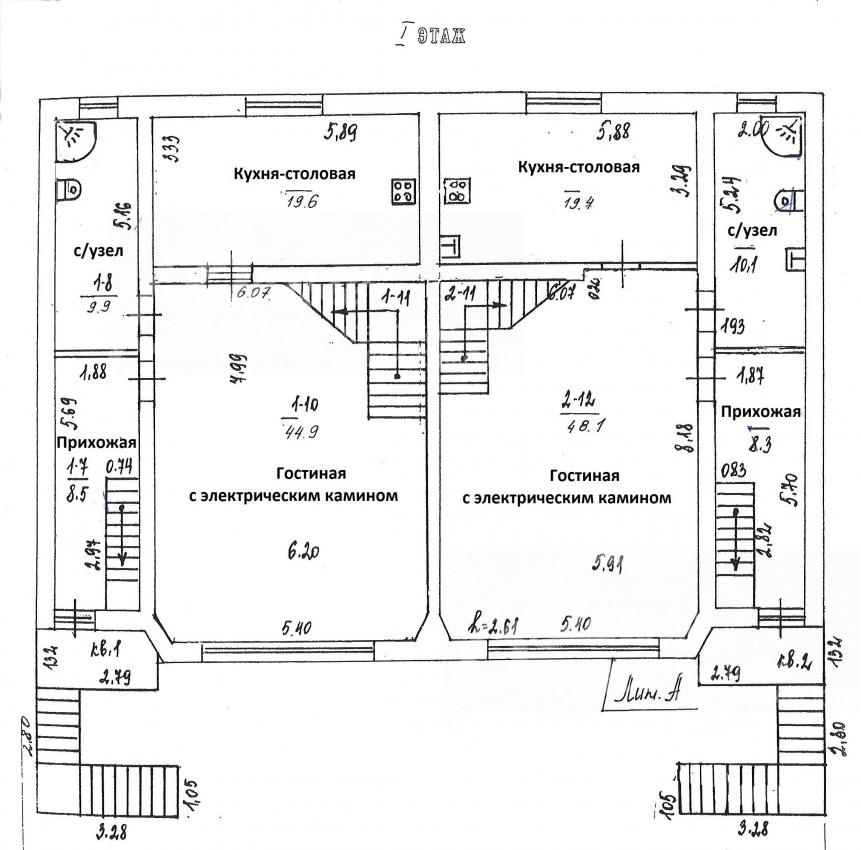 1-ый этаж: В каждой секции: крыльцо, прихожая 8.5 кв.м, с/узел 10 кв.м с душевой кабиной, гостиная 45 кв.м с камином (в правой секции гостиная 48 кв.м), кухня-столовая 19.5 кв.м