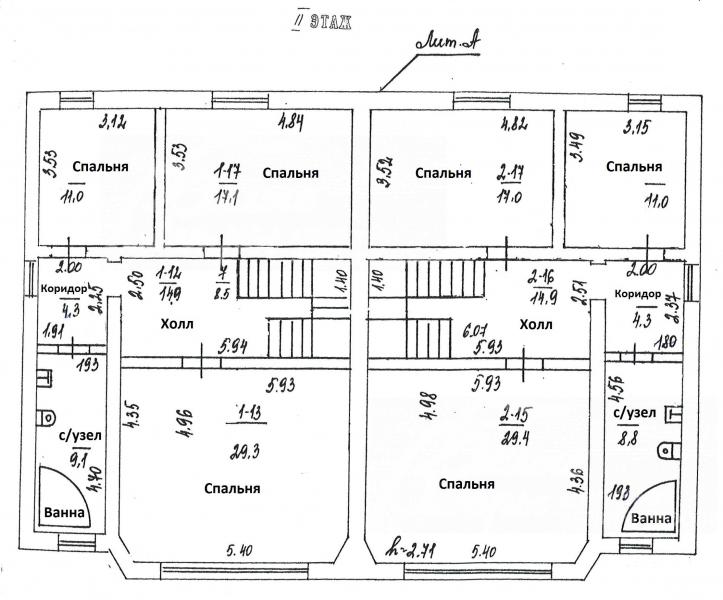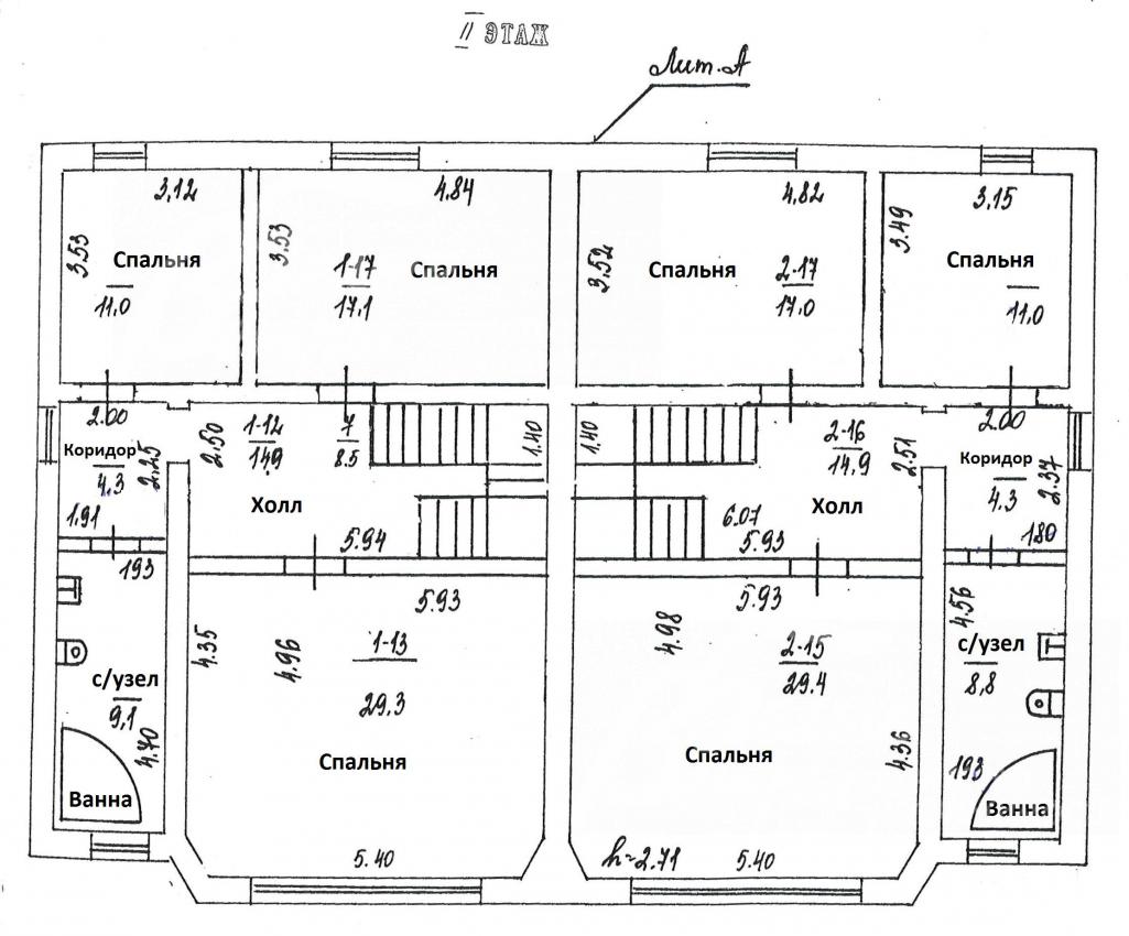 2-ой этаж: В каждой секции: холл 15 кв.м, спальня 29 кв.м, коридор 4 кв.м, с/узел 9 кв.м с ванной, спальня 11 кв.м и спальня 17 кв.м