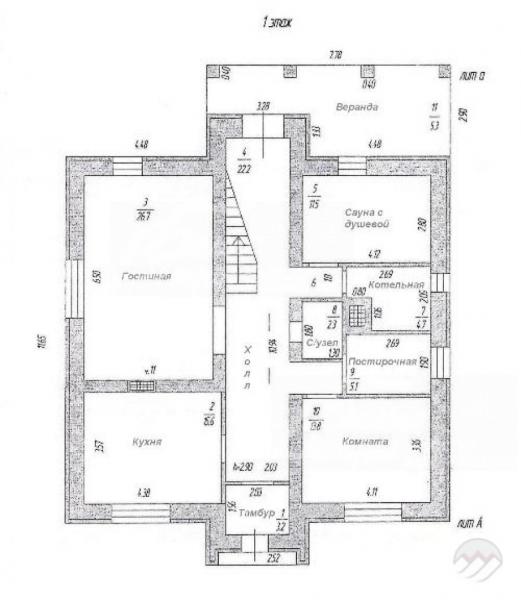 1-ый этаж: крыльцо, тамбур, холл 22 кв.м с выходом на веранду 18 кв.м, кухня 16 кв.м, гостиная 27 кв.м, жилая комната 14 кв.м, сауна 11.5 кв.м с душевой, с/узел 2.3 кв.м, котельная 5 кв.м, постирочная 5 кв.м