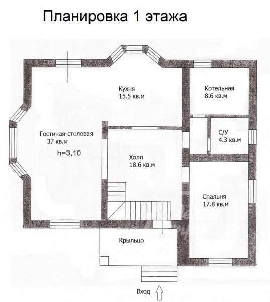 1-ый этаж: крыльцо, холл 18 кв.м, гостиная-столовая 37 кв.м с выходом на террасу и участок, кухня 15 кв.м, спальня/кабинет 18 кв.м, санузел 4 кв.м, котельная 8 кв.м