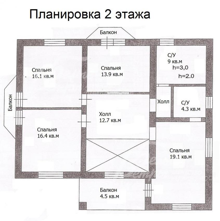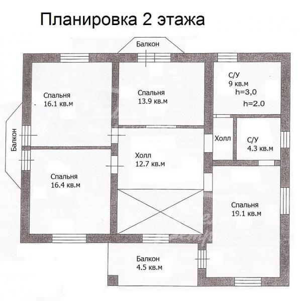 2-ой этаж: холл 13 кв.м, спальня 19 кв.м с санузлом 4 кв.м и с выходом на балкон 5 кв.м, спальня 14 кв.м с балконом, санузел 9 кв.м, две спальни по 16 кв.м с выходами на общий балкон