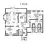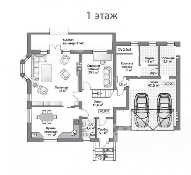 1-ый этаж: крыльцо 10 кв.м, прихожая 6 кв.м, холл 19 кв.м, санузел 4 кв.м, гараж 43 кв.м на 2 а/м, гостиная 35 кв.м с камином и выходом на крытую летнюю веранду 21 кв.м, кухня-столовая 21 кв.м, спальня/кабинет 21 кв.м, зона сауны: комната отдыха 7 кв.м с душевой 3 кв.м, санузлом 3 кв.м и парной 5 кв.м, котельная(бойлерная) 9 кв.м.