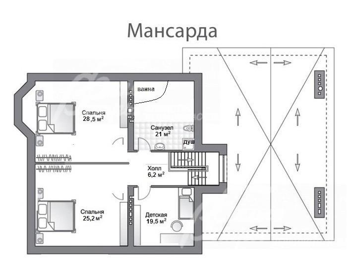 3-ий этаж: 3 спальни с мансардными окнами (20 кв.м; 25 кв.м; 29 кв.м) и с общим большим санузлом 21 кв.м.