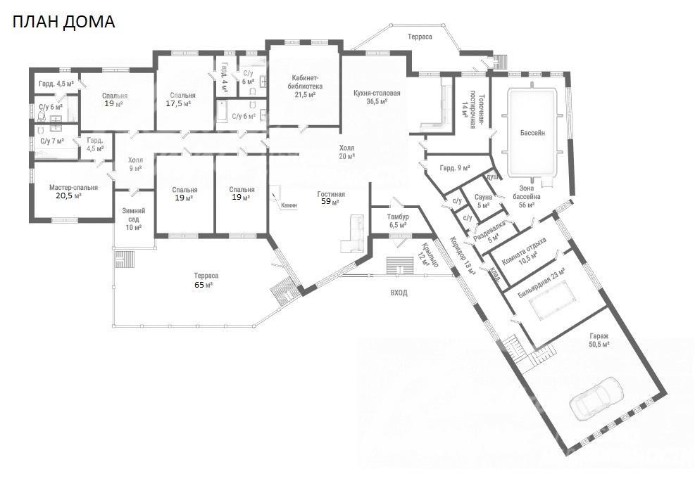 SPA зона: бассейн 56 кв.м, сауна 5.2 кв.м, комната отдыха 10.6 кв.м, бильярдная 23 кв.м, санузел 1.5 кв.м, душевая, котельная 12.8 кв.м, гараж 50.5 кв.м.