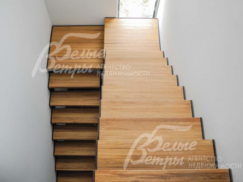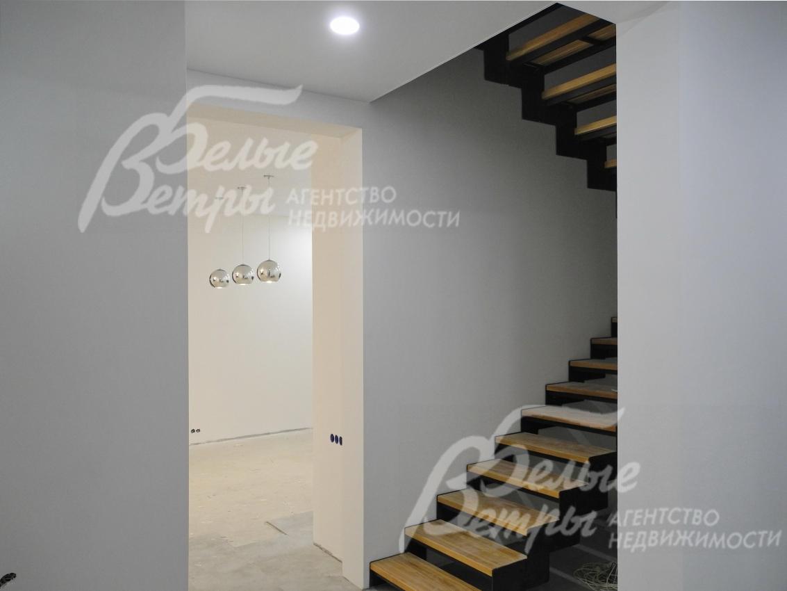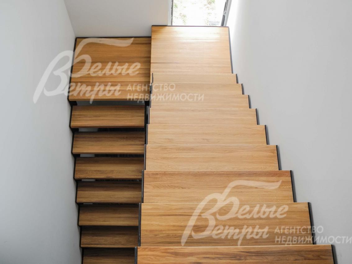 Описание внутренней отделки: красивая отделка в современном стиле, в нейтральных тонах с применением натуральных и дорогих отделочных материалов. Стены под покраску, в санузлах - плитка под бетон. На полу паркет Tarkett, керамогранит. Каркас лестницы из стали, лазерная резка, ступени - клееный брус дуб. Натяжные потолки. Качественная сантехника Roca и другие подобные бренды. Выполнены теплые полы под плиткой и в санузлах. Межкомнатные двери - эмаль или шпон дуба (фирма Волховец). Входная дверь Hoermann со стеклянными элементами (300 т.руб.). Подоконники пластиковые, глянцевые производства Германия.
