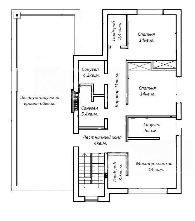 2-ой этаж: свободная планировка. Возможная планировка: мастер-спальня 14 кв.м с гардеробной 4 кв.м, санузел 5 кв.м, спальня 14 кв.м, спальня 14 кв.м с гардеробной 3 кв.м, санузел 4 кв.м, санузел 5 кв.м. Эксплуатируемая кровля 60 кв.м.