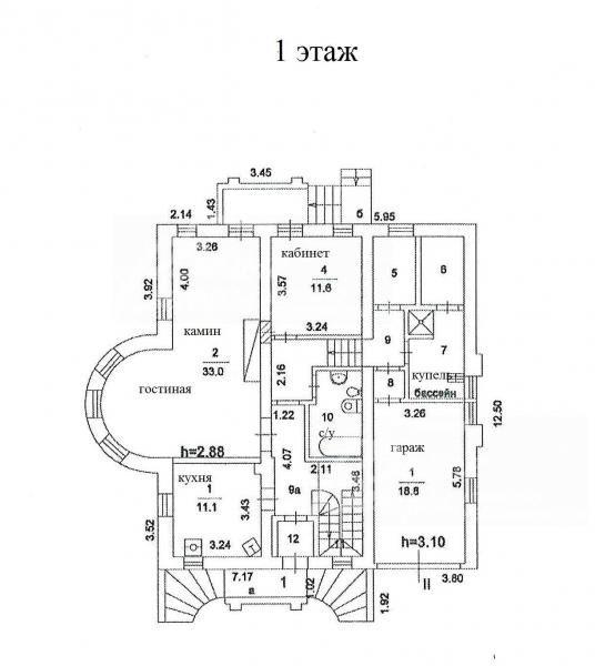 1-ый этаж: Прихожая, холл, коридор, кухня 11 кв.м, гостиная 33 кв.м, кабинет 11.6 кв.м, с/узел, котельная, сауна, купель, гараж 18.8 кв.м
