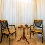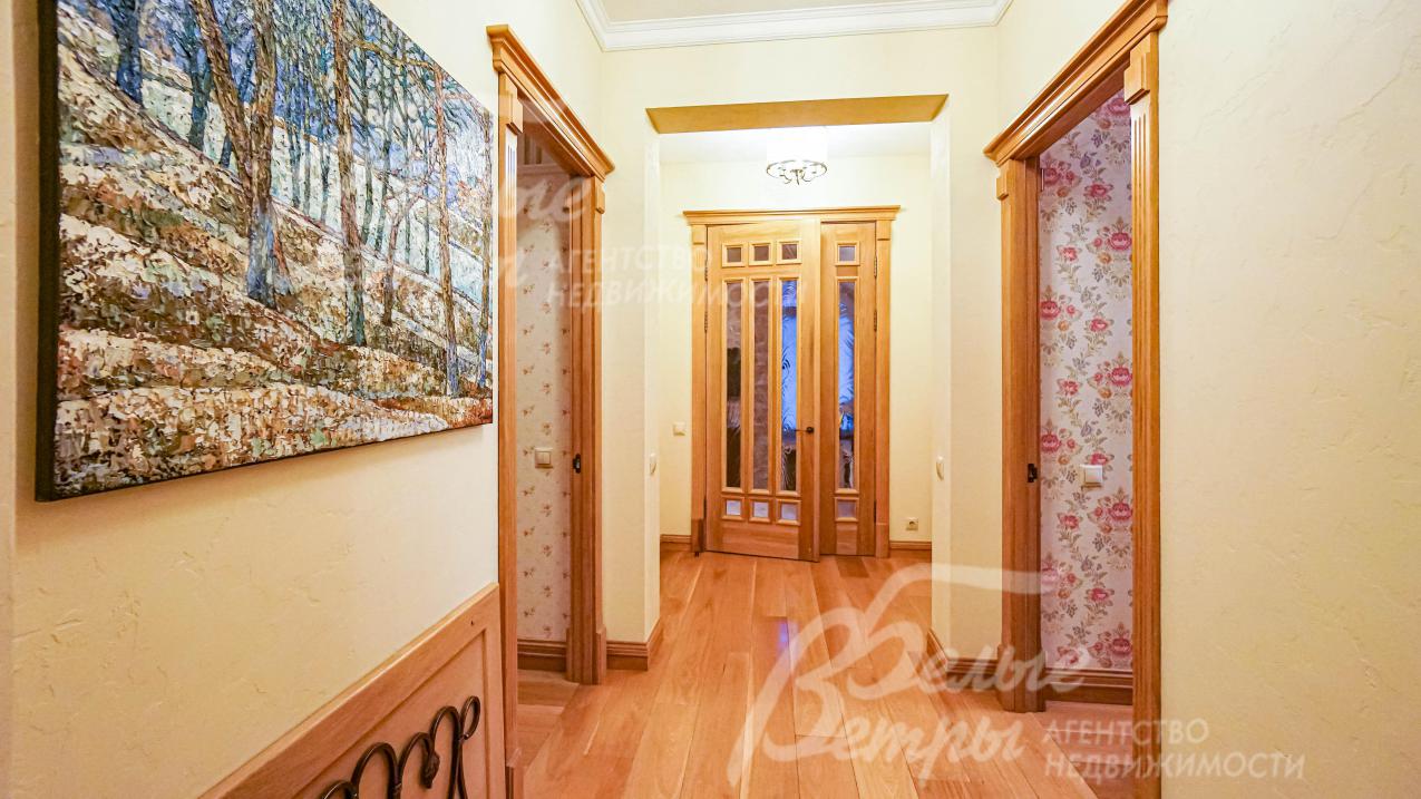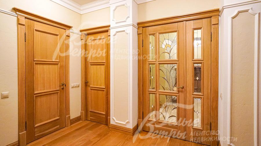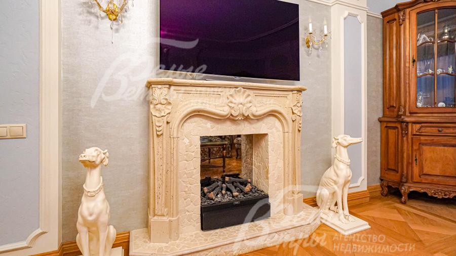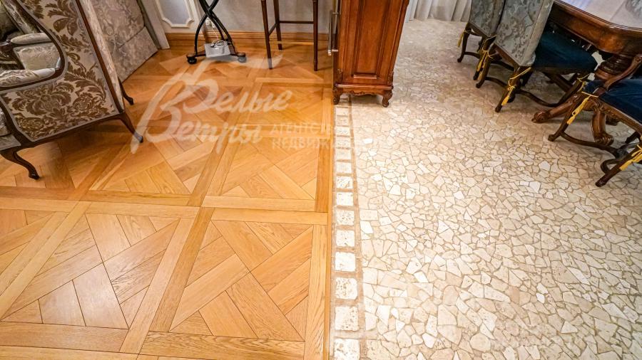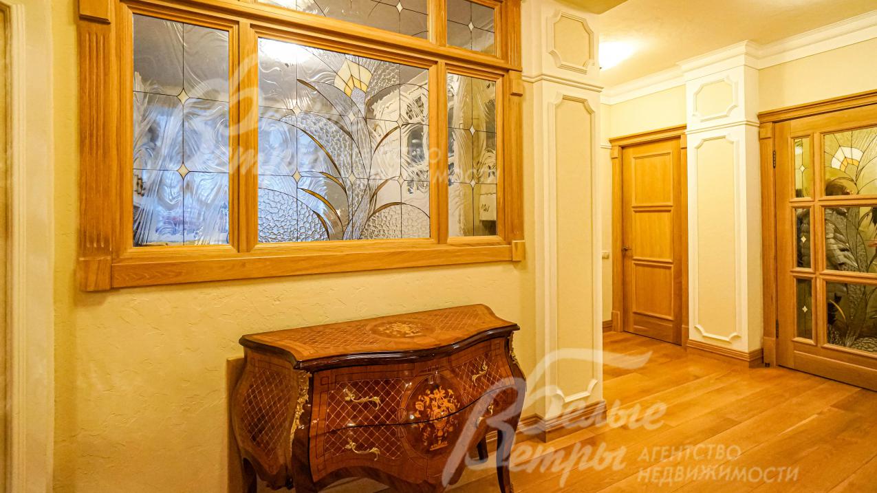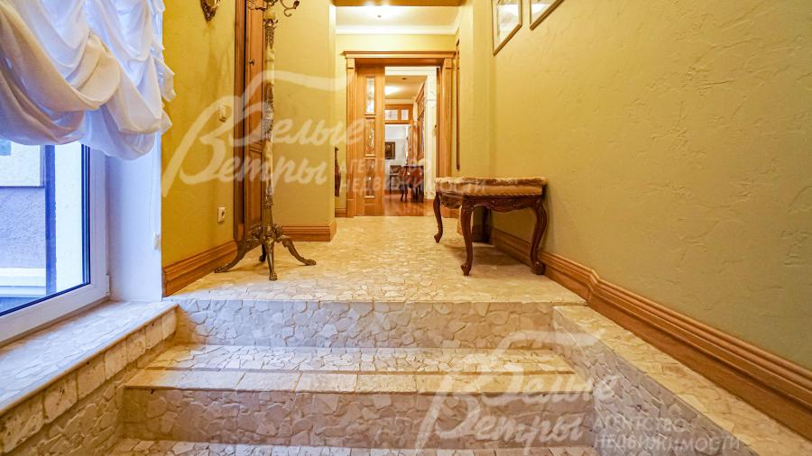 Описание внутренней отделки: классическая отделка с применением преимущественно натуральных отделочных материалов (травертин и массив дуба); на стенах декоративная штукатурка с элементами лепнины из гипса, бумажные обои, в главной спальне элемент из изразцов, в цоколе искусственный камень; на полу натуральный камень травертин (укладка мозаикой и плиткой), массив дуба 22 мм (паркетная укладка и палубная);