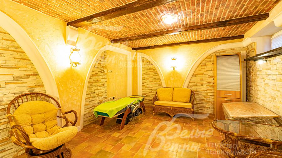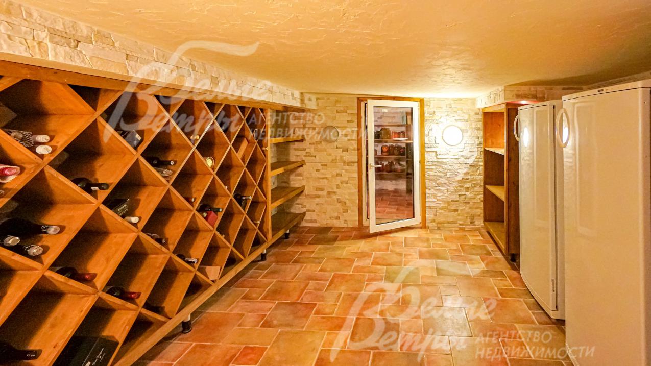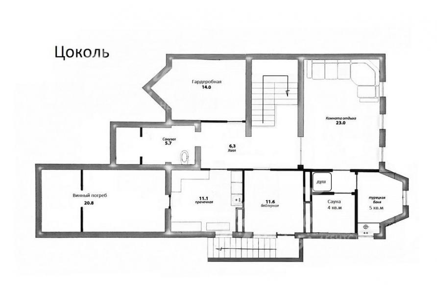 Цоколь: холл 6 кв.м, комната отдыха 23 кв.м, душевая 2 кв.м, сауна 4 кв.м, хамам 5 кв.м, прачечная 11 кв.м, винный погреб с холодной кладовой 21 кв.м, гардеробная 14 кв.м. санузел (1/2) 6 кв.м, бойлерная 12 кв.м с отдельным выходом на улицу;