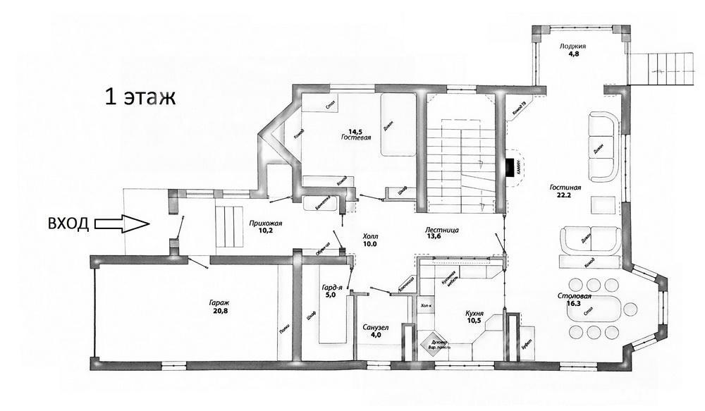 1-ый этаж: прихожая 10 кв.м, холл 10 кв.м с гардеробной 5 кв.м, лестница 14 кв.м, зона гостиной 22 кв.м с камином (портал травертин) с лоджией 5 кв.м, зона столовой 16 кв.м, зона кухни 11 кв.м, гостевая спальня 15 кв.м, санузел (1/2) 4 кв.м;