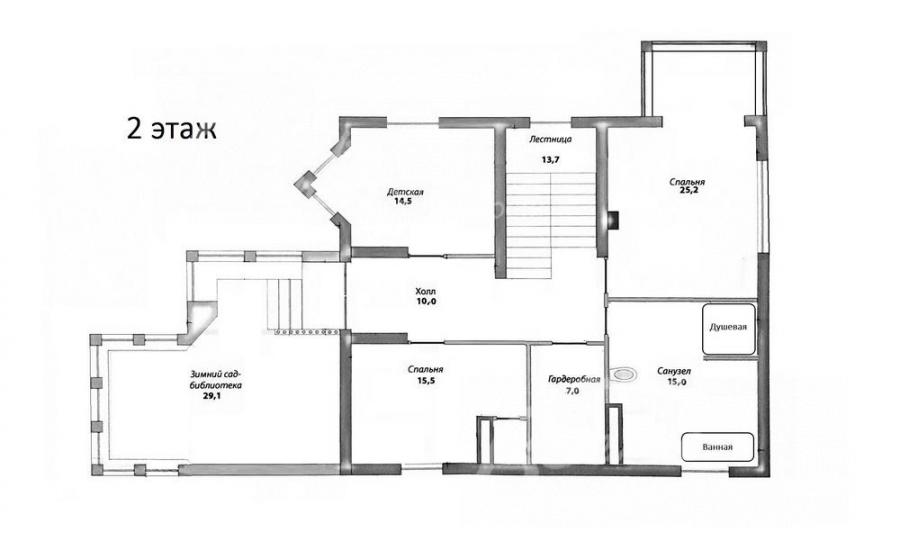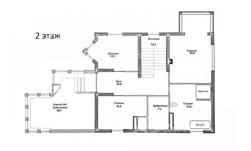 2-ой этаж: холл 10 кв.м, спальня 25 кв.м, санузел 15 кв.м с душевой и ванной, гардеробная 7 кв.м, спальня 16 кв.м, спальня 15 кв.м, зимний сад библиотека 29 кв.м;