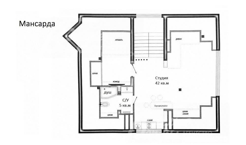 3-ий этаж: студия 42 кв.м: с зоной спальни, с зоной отдыха, с барной стойкой и мини кухней; санузел 5 кв.м с душевой;