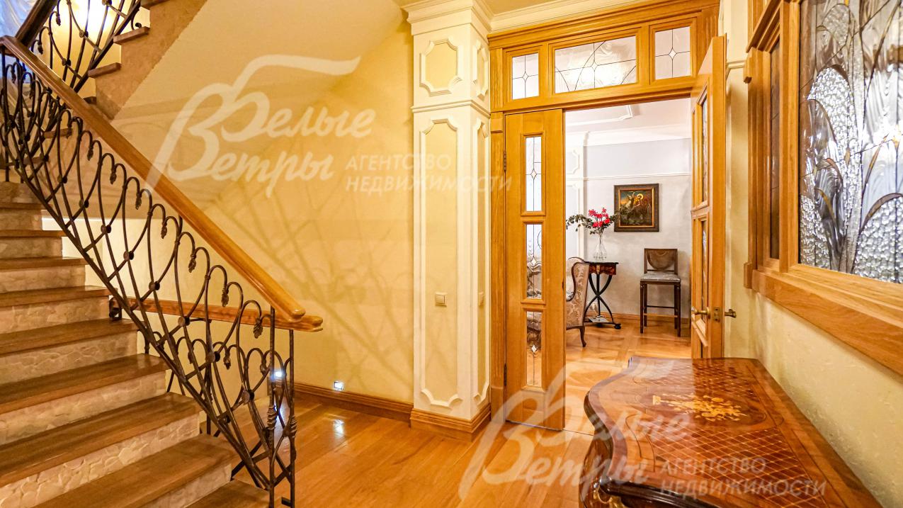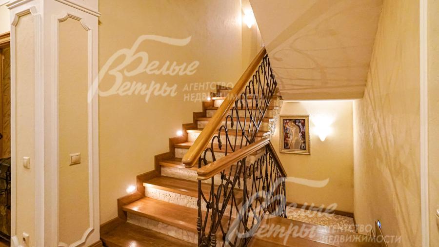 лестничный марш ж/б монолит; ступени - массив дуба с подсветкой, перила художественная ковка, поручень массив дуба; потолки выровнены окрашены или покрыты декоративной штукатуркой, так же использованы элементы лепнины из гипса (карнизы, кессоны, розетки); на мансардном этаже потолки с витражным остеклением; в цоколе в комнате отдыха искусственный камень с декоративными балками; сантехника вся установлена, преимущественно итальянской фирмы Globo; коммуникации все разведены, радиаторы секционные, электрика Legrand; двери и порталы массив дуба, присутствуют двери с витражами. В цоколе двери массив сосны брошированные (искусственно состаренные); подоконники натуральный травертин; портал камина резной из травертина, топка - биокамин;