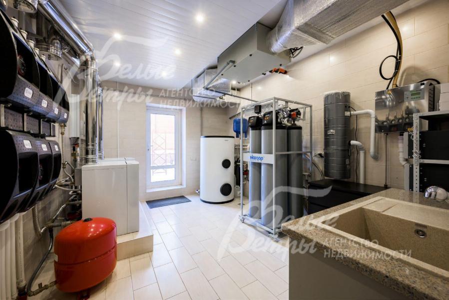 Инженерное обеспечение: в доме установлены два газовых котла по 43 кВт Vaillant, работающие в каскаде, продублировано электрокотлом Protherm. Температура в помещениях контролируется английской системой умного отопления Heatmiser Neo с возможностью удаленного контроля и управления через интернет. Горячее водоснабжение - накопительный бойлер горячей воды на 400 л Vaillant. Приточно-вытяжная вентиляция - программируемая централизованная с функциями охлаждения, обогрева и увлажнения, с возможностью установки очистителей воздуха с автоматическим увлажнением и генерированием кислорода. Встроенный пылесос - разводка по всем этажам и комнатам. Охранная и пожарная сигнализация - с подключением на пульт и возможностью постановки на охрану разных зон по выбору, тревожная кнопка, внутреннее и наружное видеонаблюдение с возможностью просмотра из любой точки мира. цифровое телевидение, домофонные мониторы на каждом этаже.