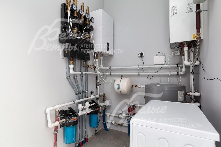 Инженерное обеспечение: установлены газовый котел Ferroli 34 кВт и резервный электрический котел, бойлер Ferroli, который подогревается от газового котла, и фильтр грубой очистки на воду. В каждой комнате функционирует естественная вентиляция, а в ванных комнатах принудительная.