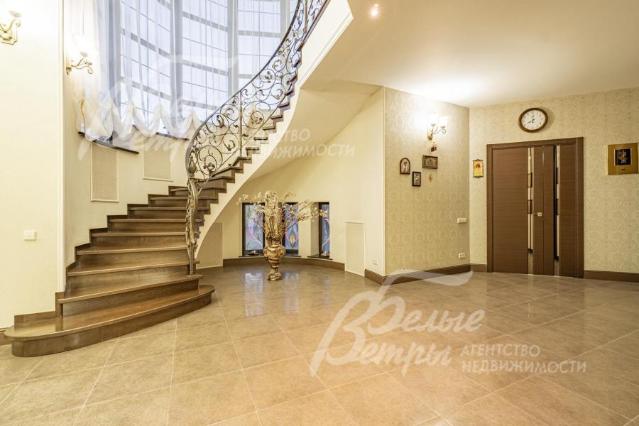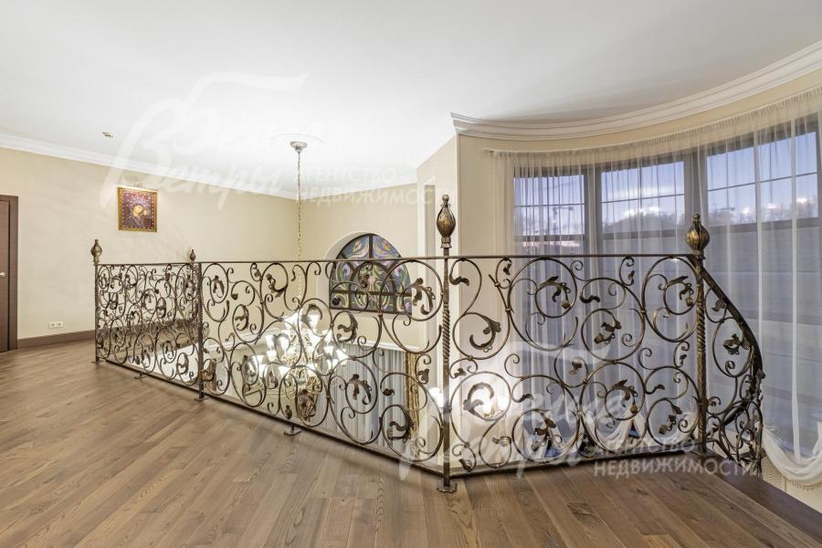 Описание внутренней отделки: отделка из материалов европейских производителей: полы - керамогранит (Испания) с подогревом, обои стен - европейские, дубовая инженерная доска Италия, красивые порталы и колонны с лепниной, двух- и трехуровневые подвесные потолки с лепниной и подсветкой, стены декорированы молдингами. Широкая радиусная лестница с художественными коваными перилами, ступени дубовые. Вся сантехника европейских производителей: Jacob Delafon, Grohe. Водяные тёплые полы (там где керамогранит). Межкомнатные двери – Sofia (Россия). Широкие подоконники из искусственного камня. Ограждающие конструкции входной группы и террас – кованые перила. На мансардном этаже на полу - немецкое ковровое покрытие.