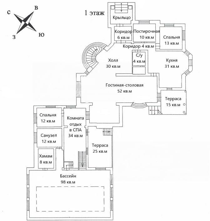 1-ый этаж: тамбур-прихожая 6 кв.м, холл 30 кв.м, постирочная-кладовая при кухне 10 кв.м, спальня 13 кв.м, санузел 4 кв.м, тепловой узел, кухня 31 кв.м, гостиная-столовая со вторым светом 52 кв.м, крытая терраса 15 кв.м, каминная 14 кв.м, комната отдыха в зоне СПА 34 кв.м, спортзал 12 кв.м, крытая терраса 25 кв.м, зона бассейна 98 кв.м (чаша 10,8*3,8 м), хамам, санузел 12 кв.м.