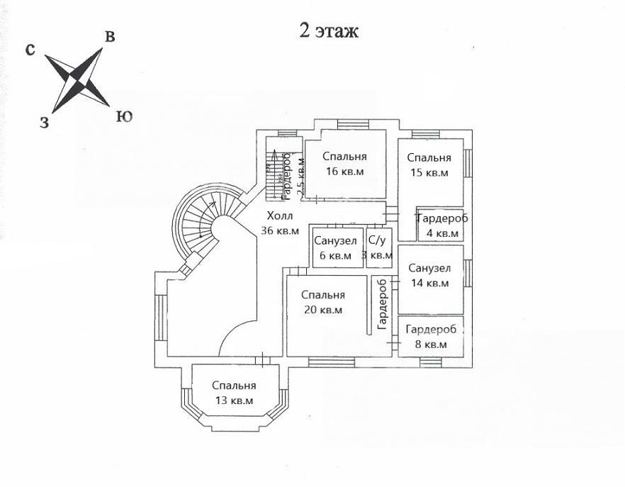 2-ой этаж: холл 36 кв.м, спальня 13 кв.м, спальня 16 кв.м, спальня 15 кв.м с гардеробной 4 кв.м, санузел 3 кв.м, ванная 6 кв.м, мастер-спальня 20 кв.м с собственными гардеробной 8 кв.м и санузлом 14 кв.м