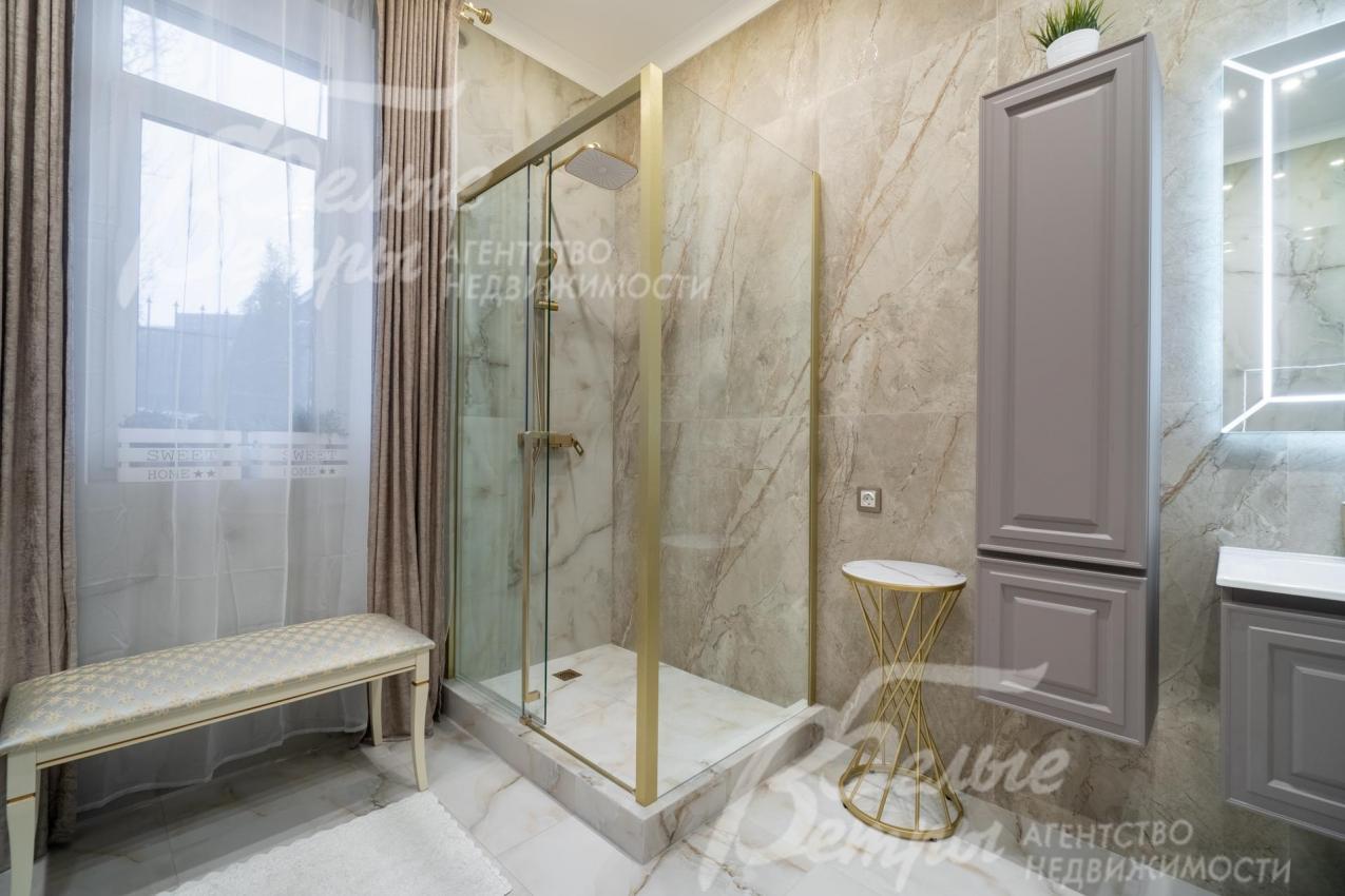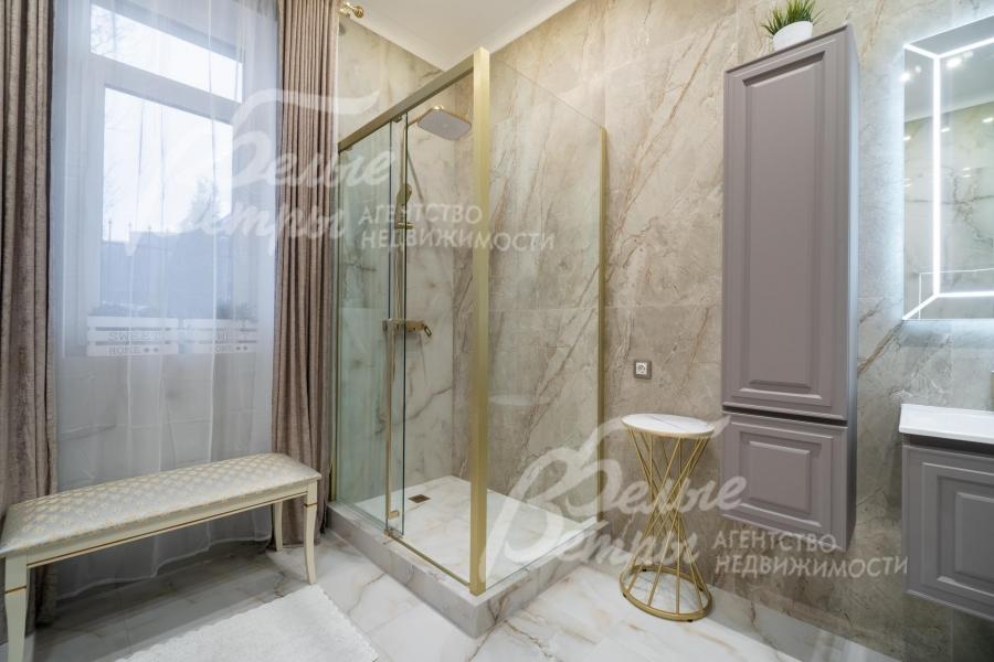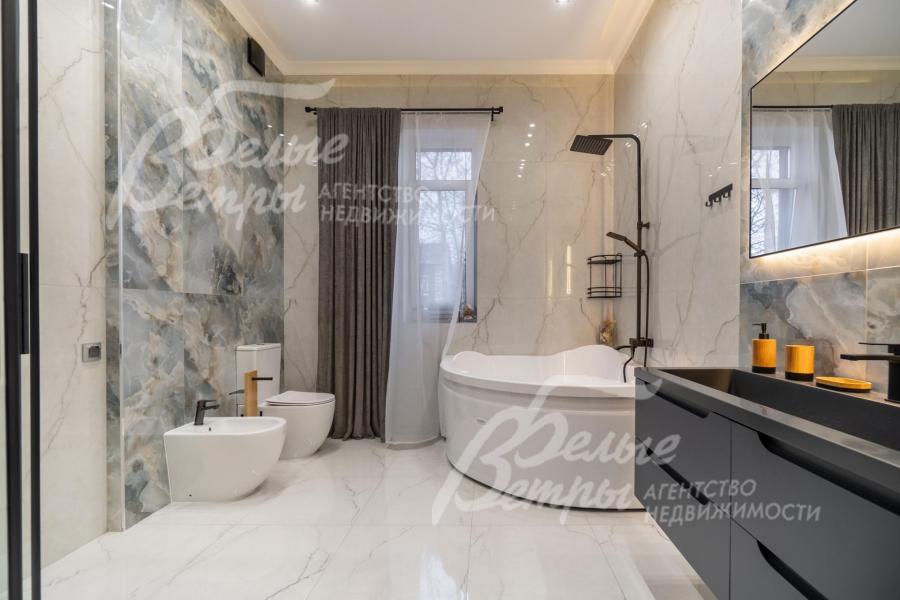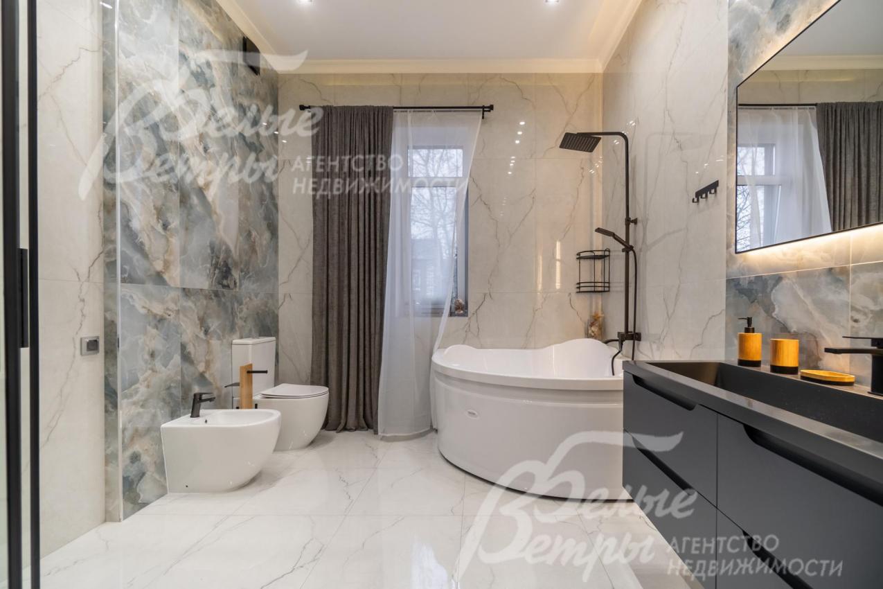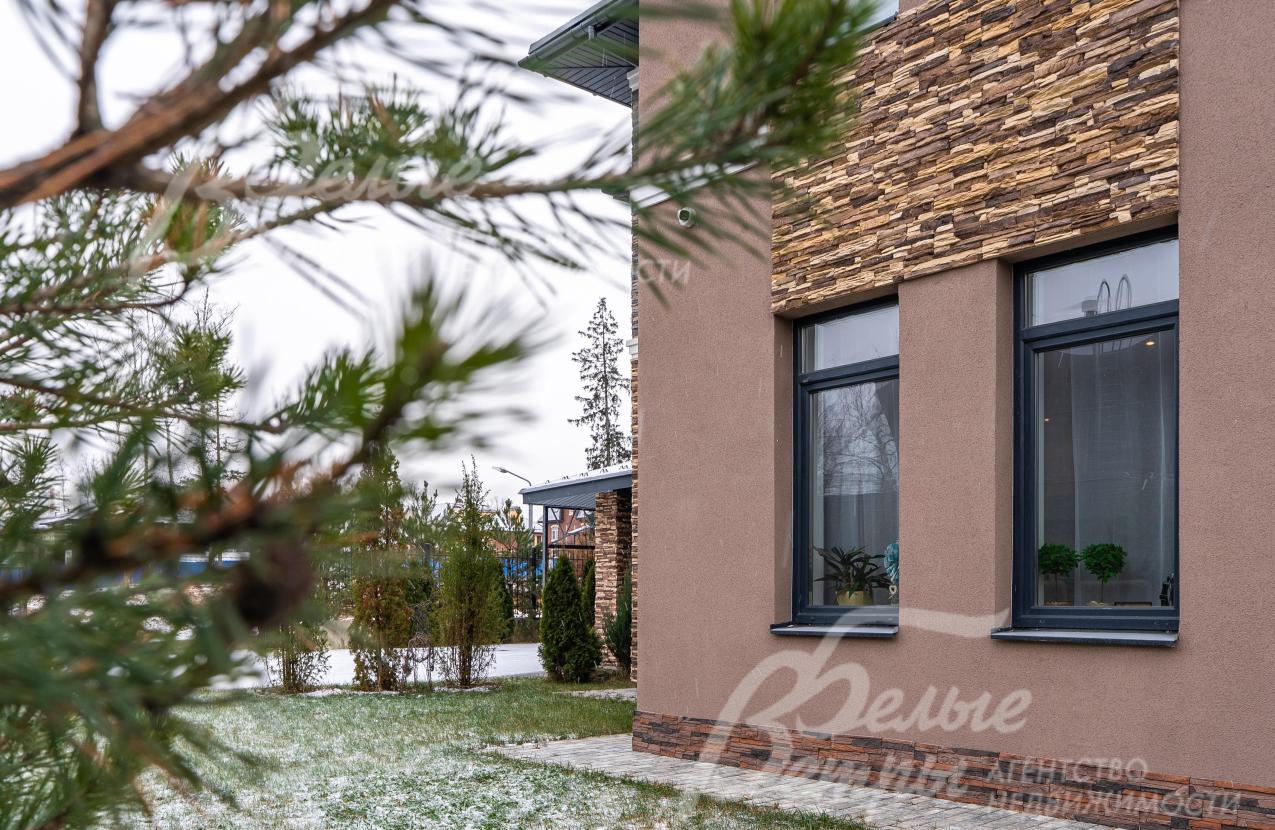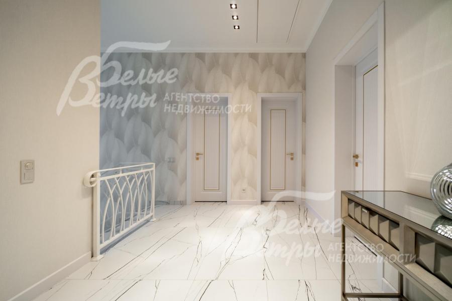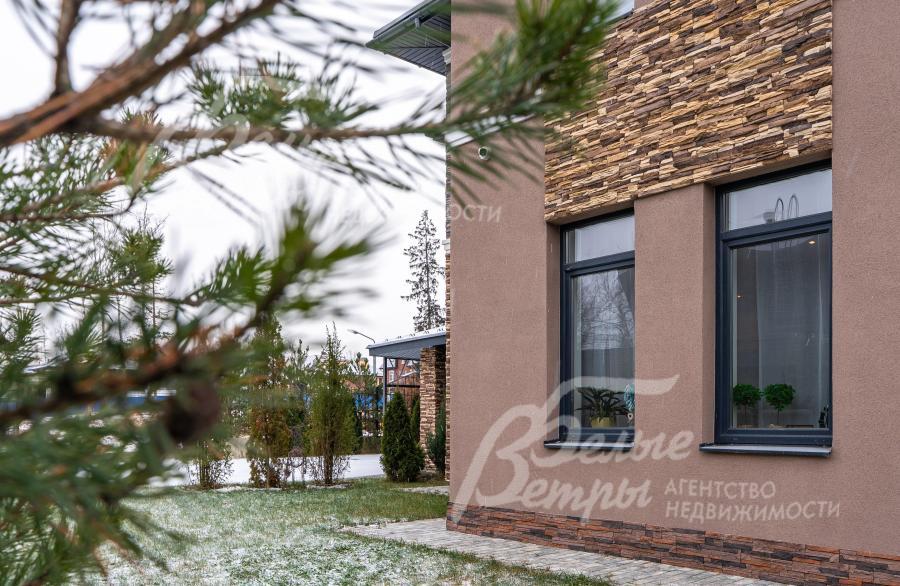 Описание внутренней отделки: выполнена отделка в современном стиле: на стенах обои, краска; на полу немецкий ламинат, в санузлах и на лестнице - керамогранит. Лестница монолитная стандартной ширины. Потолок обшит гипсокартоном. Радиаторы на всех этажах. Тёплый пол Stout на 1 этаже и во всех санузлах. Межкомнатные двери МДФ.