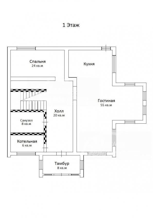 1-ый этаж: тамбур 8 кв.м, холл 20 кв.м, санузел 8 кв.м, гостевая комната 24 кв.м, кухня-столовая и гостиная 55 кв.м, котельная 6 кв.м