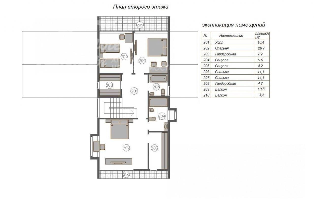 2-ой этаж: холл 10.5 кв.м, мастер-спальня 27 кв.м с гардеробной 7 кв.м, санузлом 6.5 кв.м и выходом на балкон 10.5 кв.м, первая спальня 14 кв.м и вторая спальня 14 кв.м с выходом на общий балкон 10.5 кв.м, гардеробная 5 кв.м, санузел 4 кв.м, балкон 3.5 кв.м