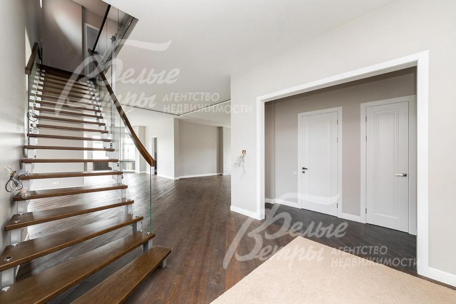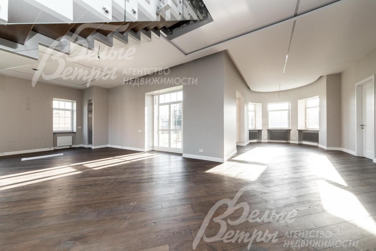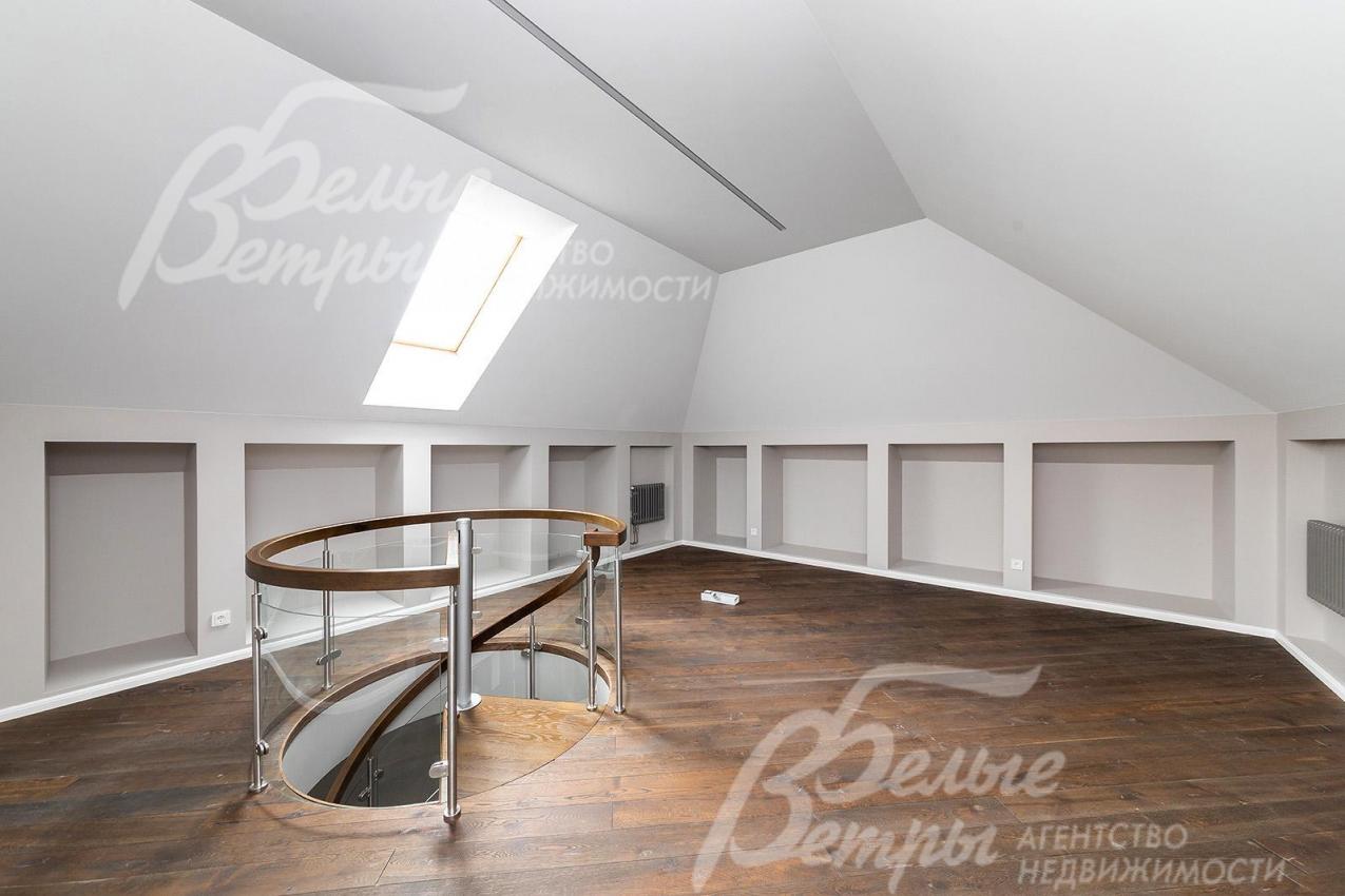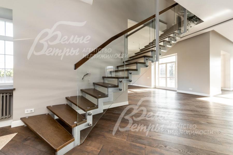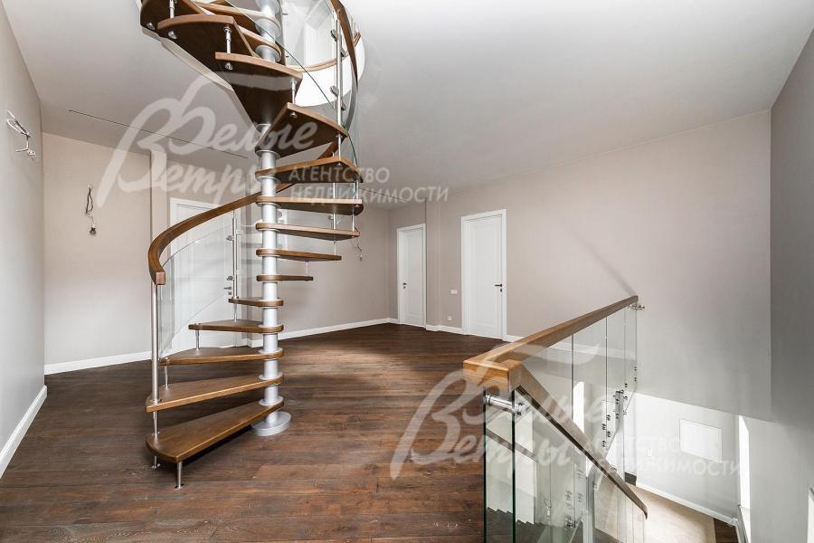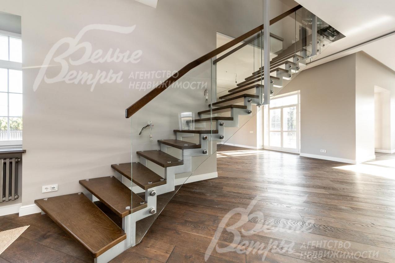 Описание внутренней отделки: под ключ: стены окрашены, в санузлах и котельной - плитка известных брендов, отделка полов массивной доской, в санузлах - плиткой, потолки сложные многоуровневые с подсветкой (проведена). Парящая лестница на металлическом каркасе, ступени из массива, ограждение - стекло, перила также из массива. На мансардный этаж - винтовая лестница. Вся сантехника импортная известных мировых брендов (Duravit). Разводка коммуникаций выполнена под ключ, стальные радиаторы, напольные конвекторы. Межкомнатные двери белого цвета с качественной фурнитурой. Подоконники - искусственный камень. Кованное ограждение террас и балконов.