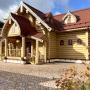 3. Бревенчатая беседка в едином архитектурном стиле с домом (резные колонны, мягкая кровля красного цвета). В ней есть освещение, стол со скамьями. Рядом обустроен бревенчатый колодец;