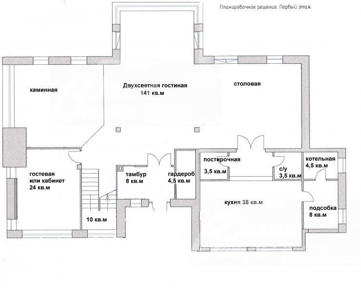 1-ый этаж: прихожая 8 кв.м, гардеробная 4.5 кв.м, гостевая спальня 24 кв.м, гостиная-каминный зал 141 кв.м, кухня 38 кв.м, постирочная 3.5 кв.м, с/у 3.5 кв.м, две подсобки