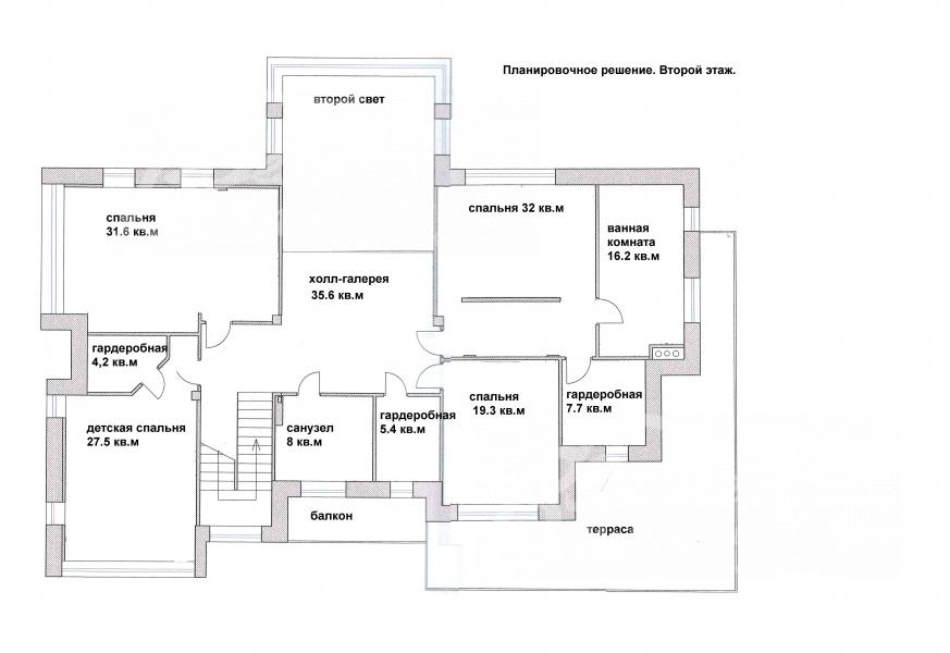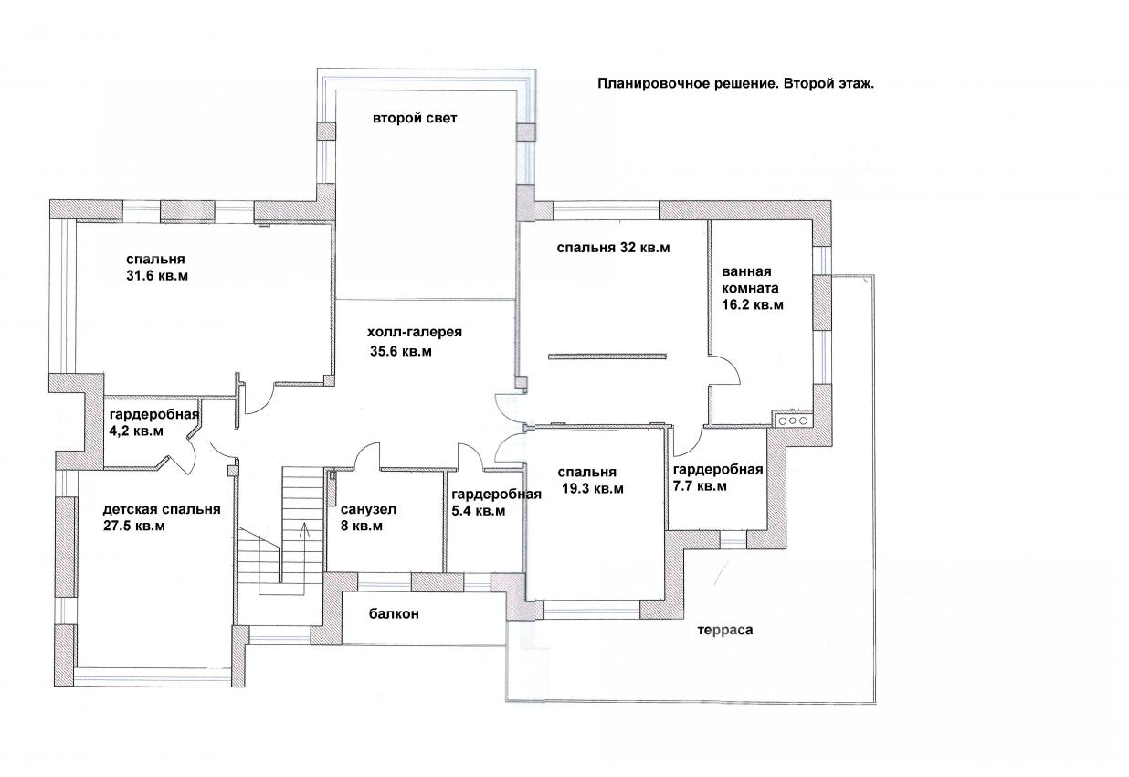 2-ой этаж: холл 36 кв.м, спальня 27.5 кв.м с гардеробная, спальня 32 кв.м с гардеробной 5.5 кв.м, ванная комната 8 кв.м, хозяйская спальня 32 кв.м с гардеробной 8 кв.м и ванной комнатой 16 кв.м, кабинет 19 кв.м