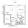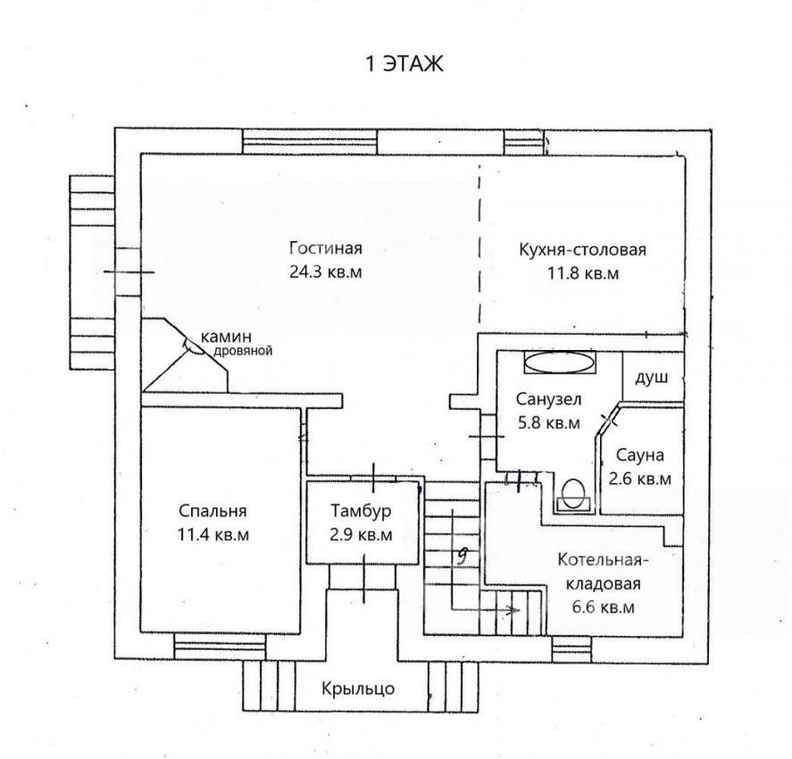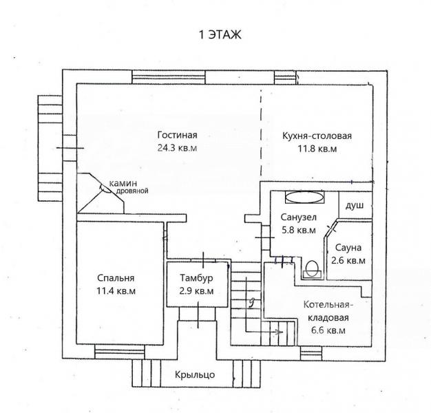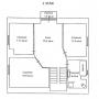 1-ый этаж: крыльцо 2 кв.м, тамбур-прихожая 3 кв.м, коридор 4 кв.м, кухня-столовая-гостиная с камином и выходом на участок 36 кв.м, зона сауны 9 кв.м с душем, с санузлом и парной, спальня 11 кв.м, бойлерная 7 кв.м.