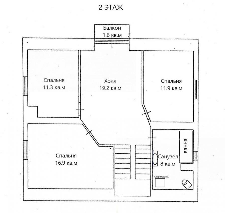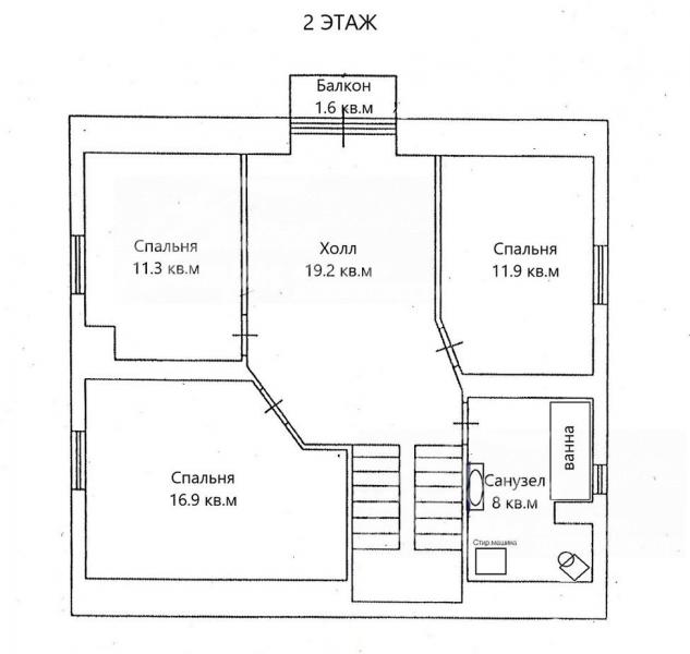 2-ой этаж: холл-гостиная 20 кв.м с балконом, 3 спальни = (17, 12 и 12 кв.м), санузел с ванной 8 кв.м