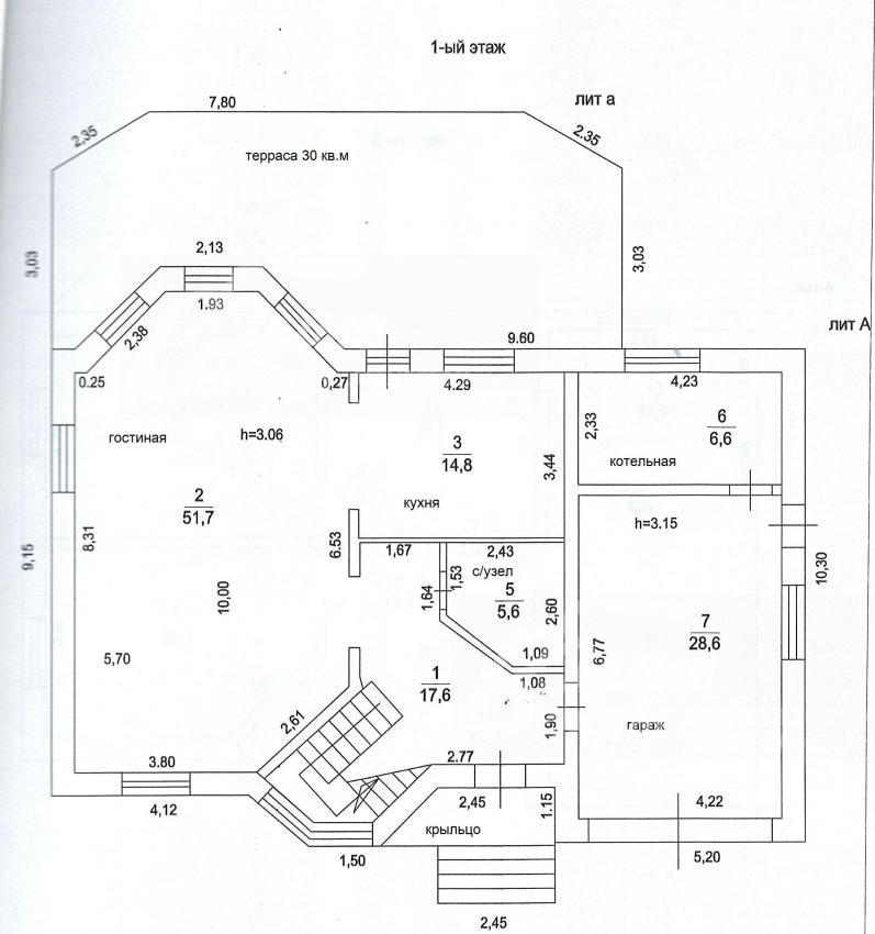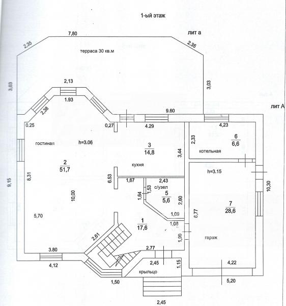 1-ый этаж: гостиная 52 кв.м, кухня 15 кв.м, коридор 17.6 кв.м, котельная, гараж 29 кв.м, санузел 5.6 кв.м, терраса 30 кв.м