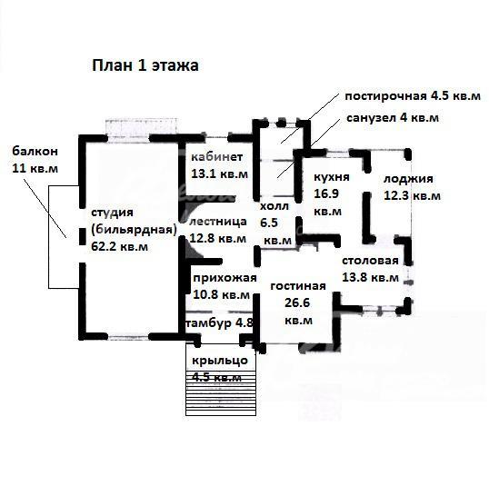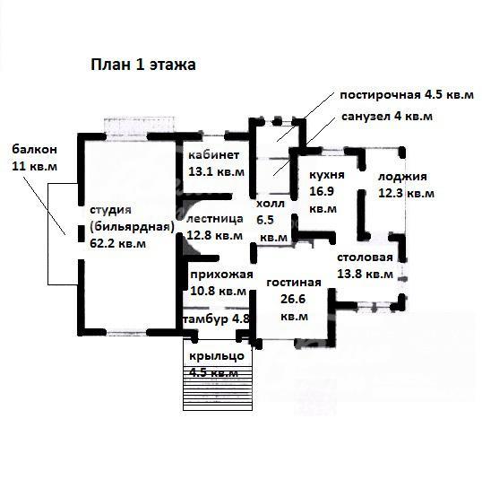 1-ый этаж: гараж на 3 а/м, прихожая 15 кв.м, холл, гостиная 30 кв.м, кухня 15 кв.м, столовая 12 кв.м, с/узел, спальня 16 кв.м