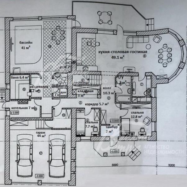 1-ый этаж: тамбур 3 кв.м, холл 10 кв.м, коридор 6 кв.м, гардеробная 8 кв.м, спальня 13 кв.м, санузел 5 кв.м, постирочная 7 кв.м, кухня-столовая-гостиная 49 кв.м, лестница 3 кв.м, кладовая 3 кв.м, раздевалка 8 кв.м, санузел 2 кв.м, душевая 2 кв.м, бассейн 42 кв.м, баня 6 кв.м, котельная 7 кв.м, гараж 44 кв.м, кладовая 4 кв.м;