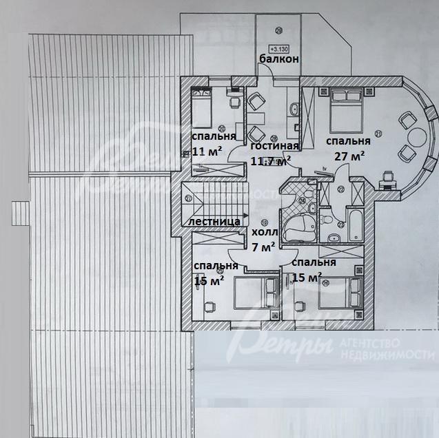 2-ой этаж: холл 7 кв.м, спальня 11 кв.м, спальня 27 кв.м, гардеробная 3 кв.м, санузел 4 кв.м, санузел 5 кв.м, спальня 15 кв.м, спальня 15 кв.м, лестница 7 кв.м, гостиная 12 кв.м, балкон 7 кв.м;