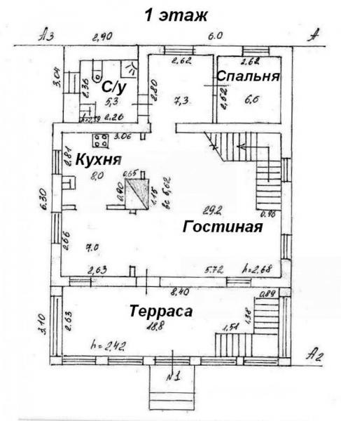 1-ый этаж: застекленная терраса 19 кв.м, гостиная с камином 29 кв.м, кухня-столовая 15 кв.м, спальня, ванная комната