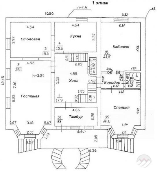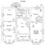 1-ый этаж: прихожая 10 кв.м, холл 18 кв.м, с/узел, кухня 15.6 кв.м, столовая с камином 18 кв.м, гостиная с эркером 35 кв.м, хозяйский блок: кабинет 22.5 кв.м, спальня 20 кв.м, с/узел.