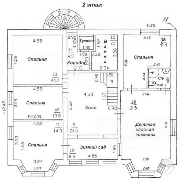 2-ой этаж: холл 22 кв.м с выходом в зимний сад, детский блок: игровая комната 31 кв.м, спальня 17 кв.м с с/узлом; еще три спальни 21, 14 и 13.8 кв.м, туалет, ванная 7 кв.м