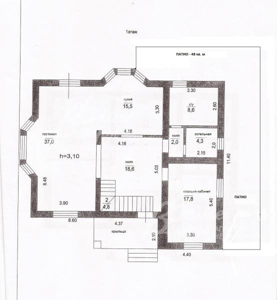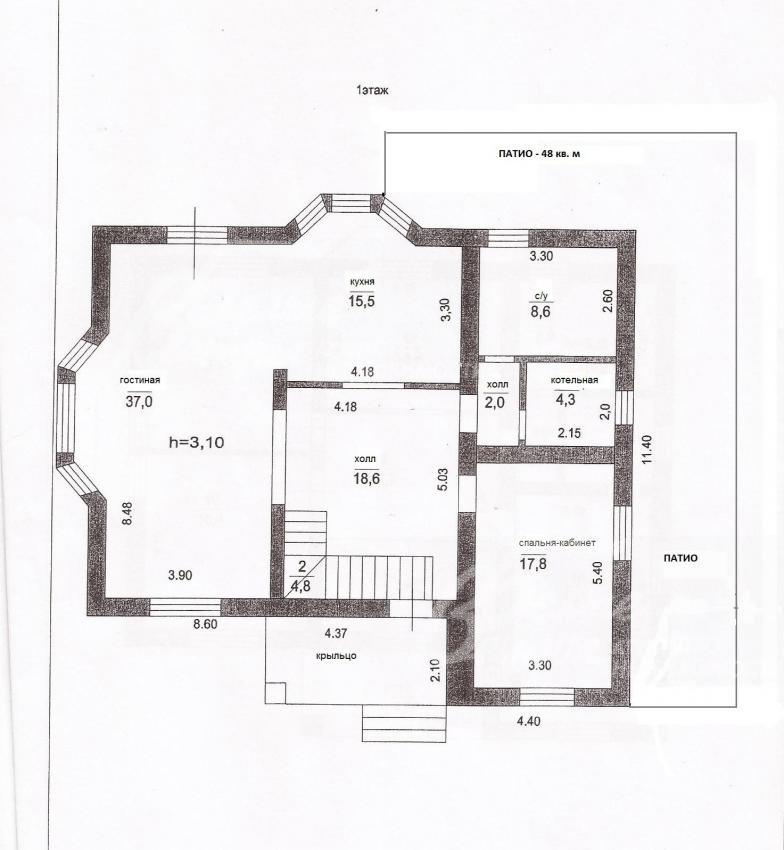 1-ый этаж: крыльцо, холл 18.6 кв.м, гостиная-столовая 37 кв.м с выходом на участок, кухня 15.5 кв.м, спальня/кабинет 18 кв.м, с/узел 8.6 кв.м, котельная 4.3 кв.м