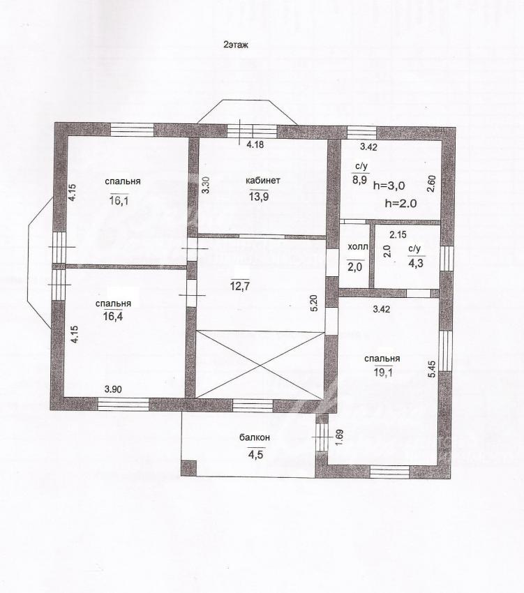 2-ой этаж: холл 12.7 кв.м, спальня 19 кв.м с выходом на балкон 4.5 кв. м и с/узлом 4.3 кв.м, две спальни по 16 кв.м с выходами на общий балкон, спальня 13.9 кв. м и с/узел 8.9 кв. м