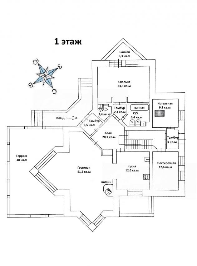 1-ый этаж: большая терраса ок.50 кв.м, холл 20 кв.м, гардеробная, с/узел, гостиная 51 кв.м с камином и вторым светом, кухня 16.6 кв.м, постирочная-хозяйственная, спальня 23 кв.м с балконом и с/узлом